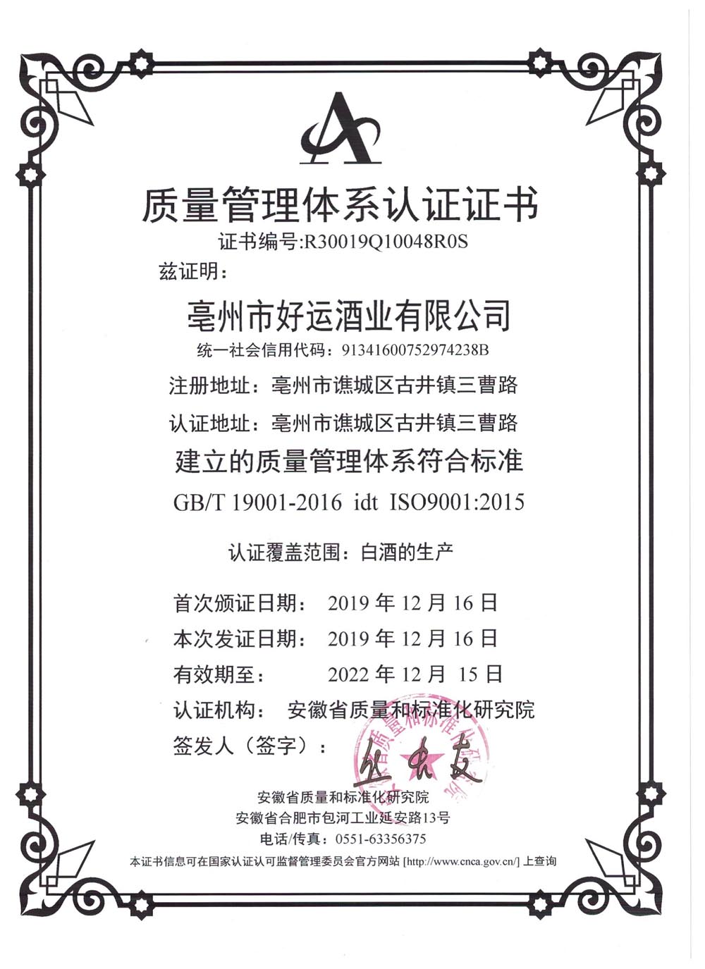質(zhì)量管理體系認(rèn)證證書(shū)